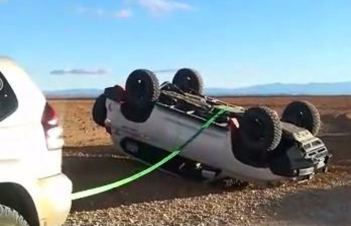 En una carretera en obras en la zona del Atlas, el guía reventó una rueda trasera, que la verdad no estaba en muy buen estado. Mientas cambiaban la rueda, un Toyota que iba siguiendo al primer coche (el FJ) no entendió bien las indicaciones que le dieron por emisora y tras la nube de polvo del coche que le precedía apareció un montón de tierra que marcaba la carretera cortada y un desvió a la izquierda.